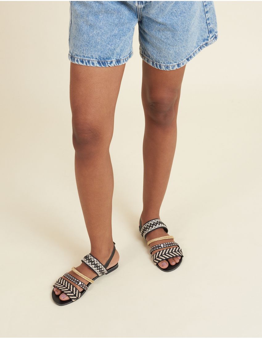 Sandália Média Tiras Couro encerado com Aplicação - Camel