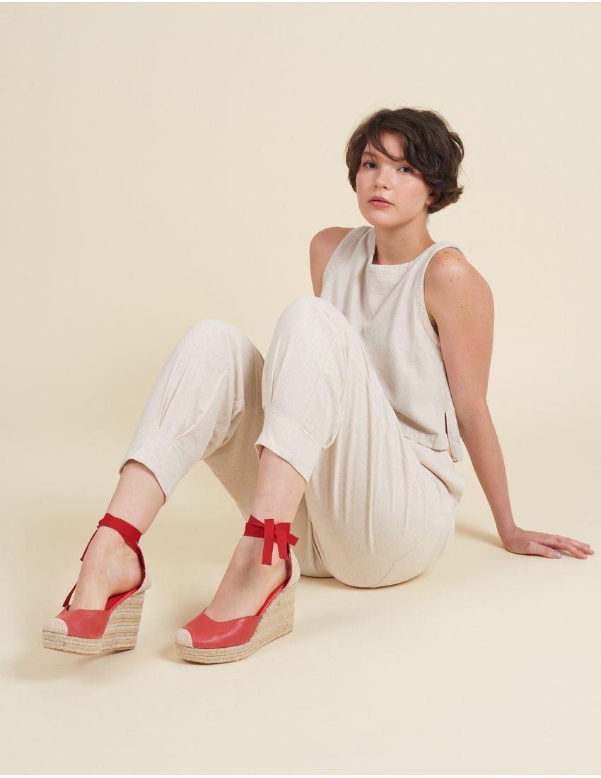 Anabela Alta Couro Tiras Entrelaçadas - Camel