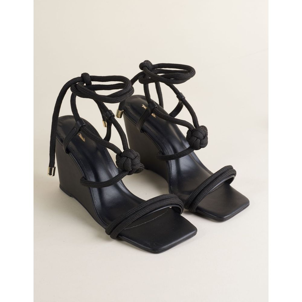 Anabela em cadarço com detalhe de nó no peito do pé. Palmilha soft e salto forrado. Salto: 9,5cm. Delicada e feminina, perfeita para ocasiões especiais.
