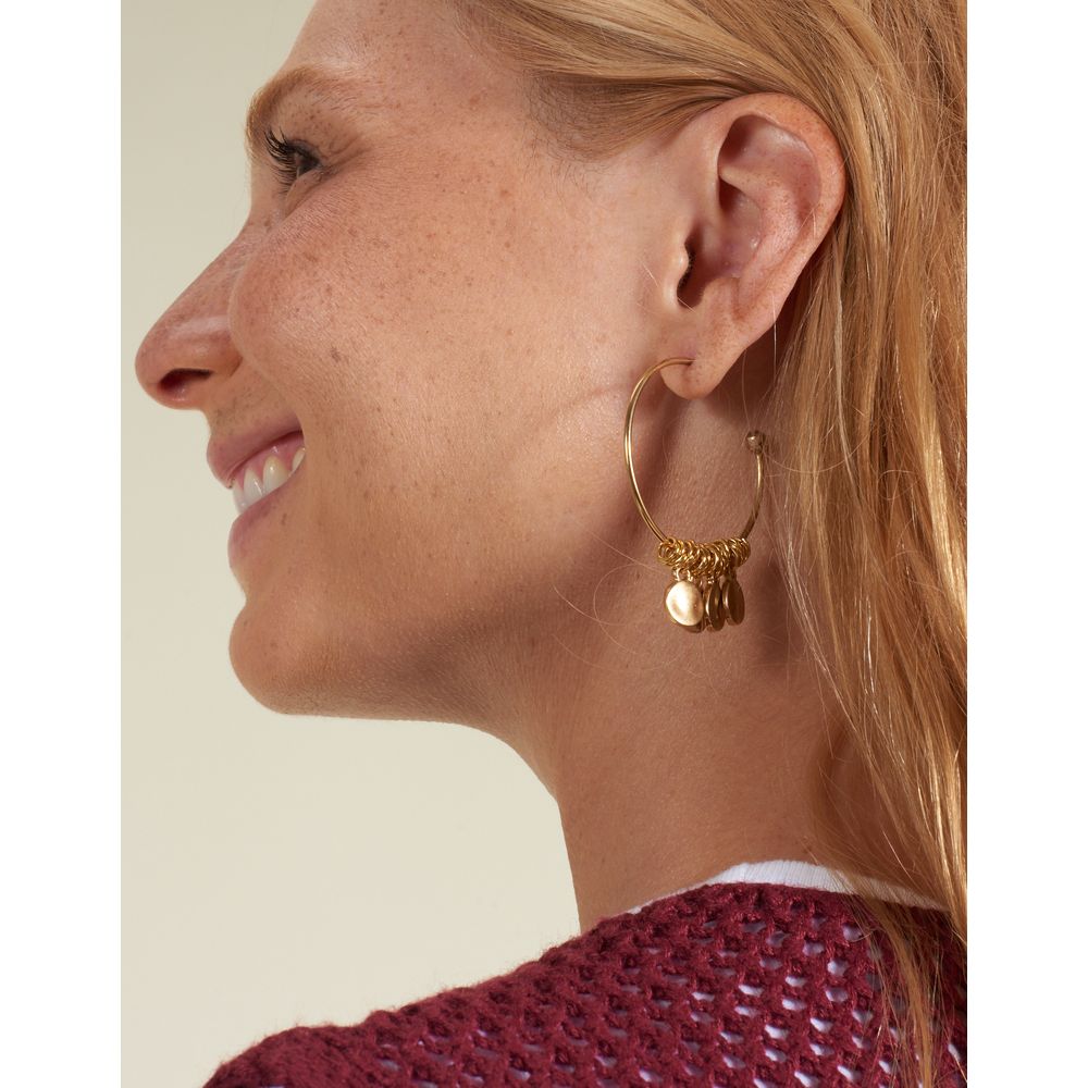Argola com medalhas penduradas que adicionam movimento e um toque moderno ao visual. Leve e versátil, possui fechamento por tarraxa, garantindo praticidade e segurança no uso.