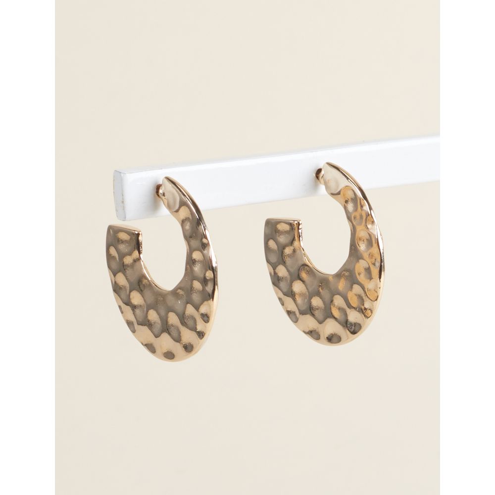 Argola média de metal em formato irregular, com acabamento martelado. Fechamento por tarraxa. Medidas: 3,3cm (D)