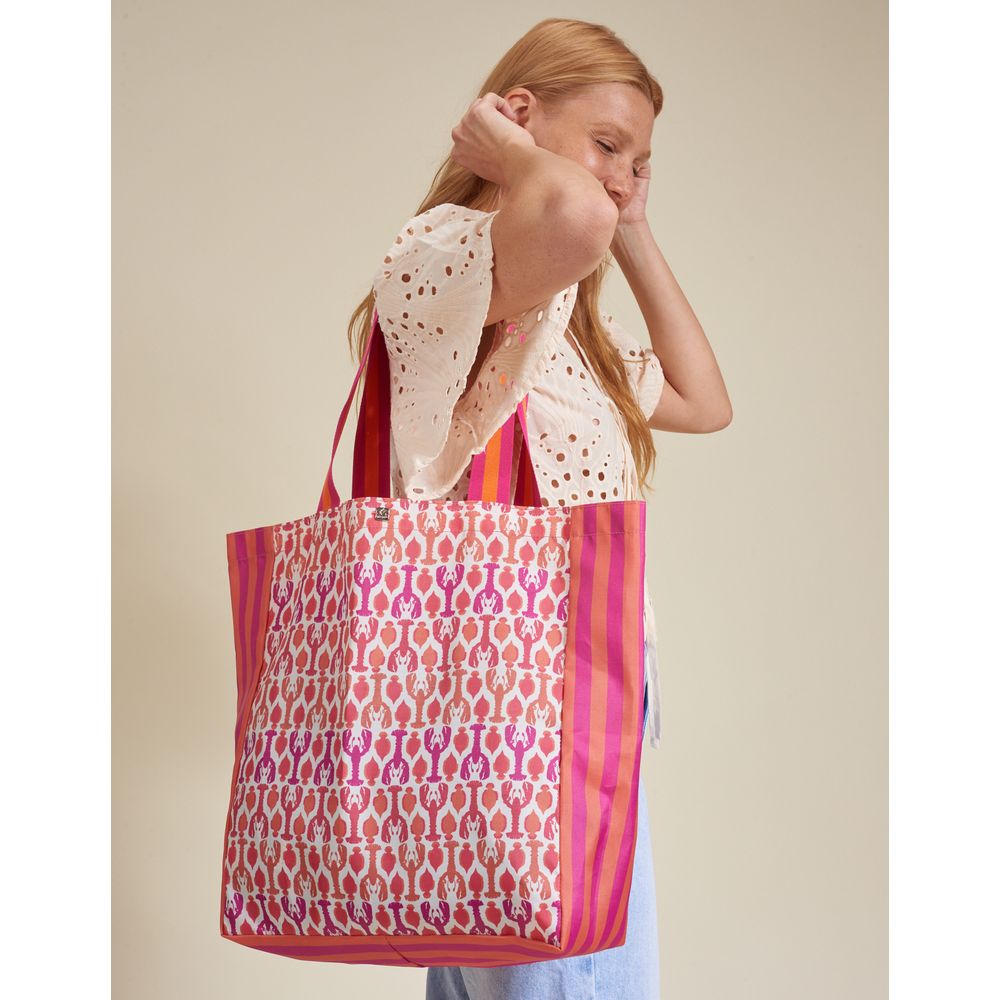 Bolsa em tecido tipo nylon com estampa exclusiva Via Mia e laterais em listra coordenada. Bolso interno com fechamento em zíper e assinatura Via Mia em plaquinha de metal. Medidas: 43cm (A) x 38cm (L) x 16cm (P). Colorida e descontraída, tem o mood perfeito para os dias de sol.