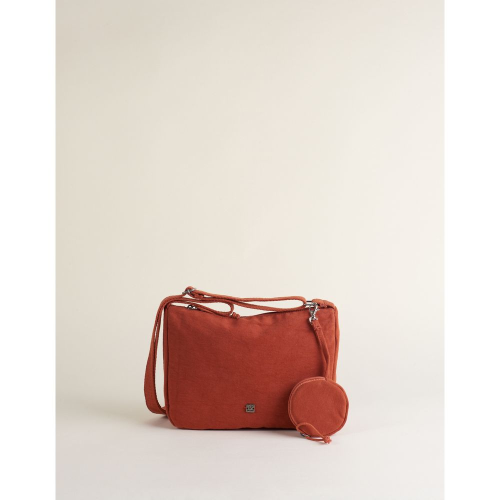 Bolsa retangular em lona com mini necessaire redonda removível. Fechamento em zíper e alça de cadarço regulável. Medidas: 18cm (A) x 26cm (L) x 7cm (P). Funcional e despojada, ideal para looks casuais.