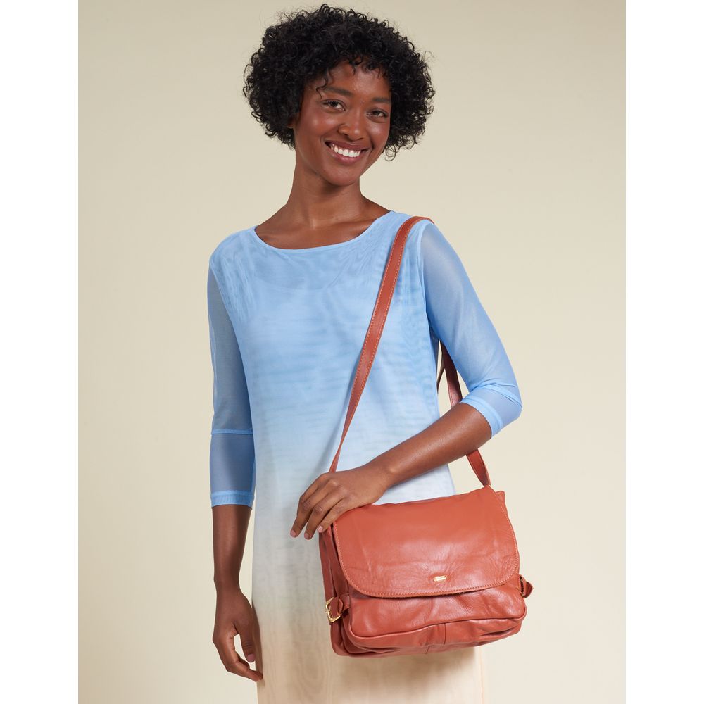 Bolsa em couro macio com fechamento por botão ímã. Conta com duas divisórias principais e duas tampas, além de alça tiracolo regulável.