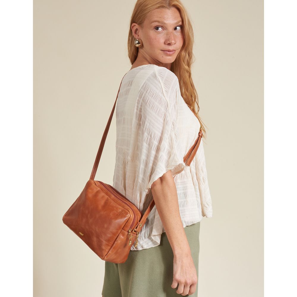 Bolsa em couro encerado com fechamento em zíper. Possui duas repartições e duas alças: tiracolo ajustável em couro e alça de ombro em cadarço. Medidas: 18cm (A) x 25cm (L) x 10cm (P). Compacta e funcional, ideal para quem gosta de praticidade.
