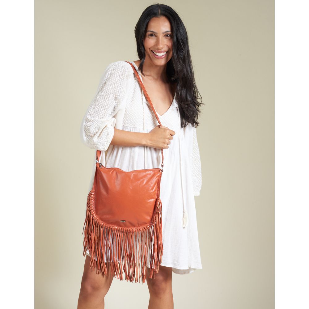 Bolsa média em couro macio com fechamento em zíper. Alça tiracolo trançada no mesmo material, detalhe de franjas ao longo do corpo e assinatura Via Mia retangular em metal. Medidas: 25cm (A) x 30cm (L). Um toque boho e cheio de estilo para o seu look.