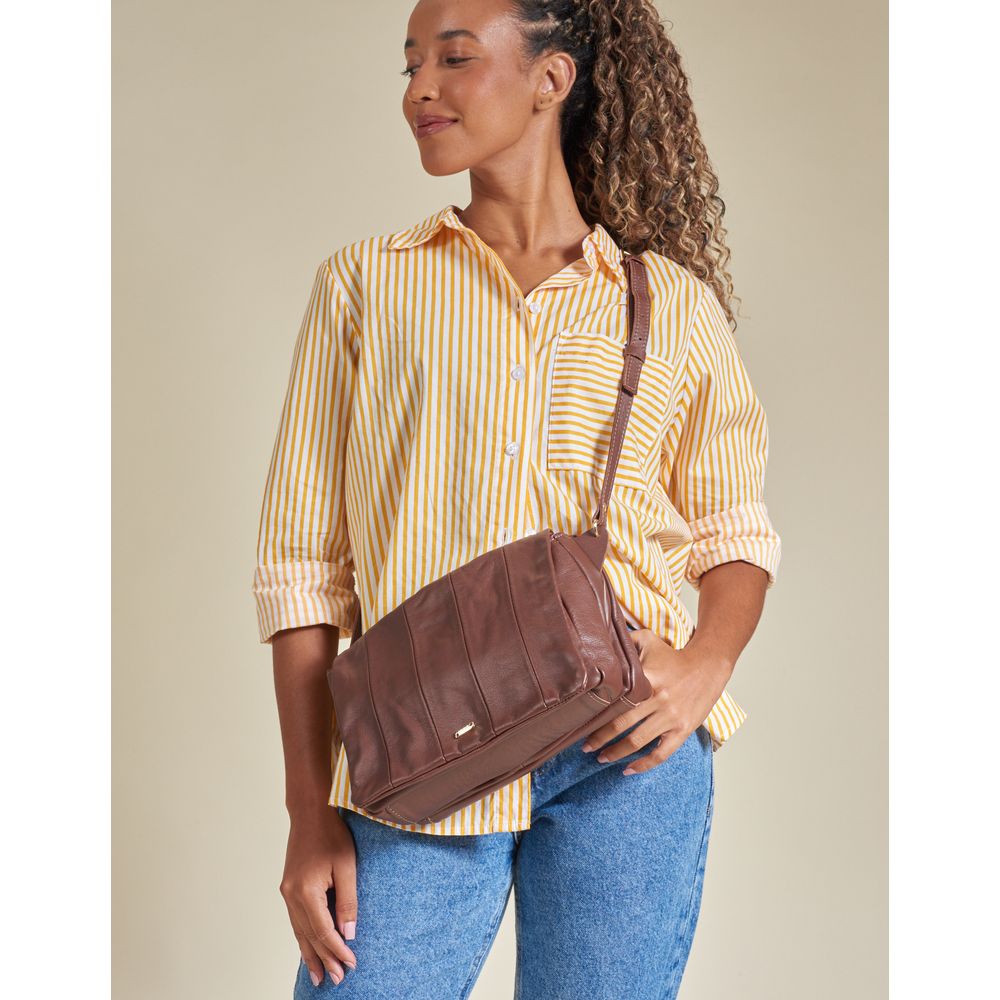 Bolsa média retangular em couro macio, com recortes frontais. Possui alça tiracolo em couro, fechamento por botão de ímã na tampa, divisórias internas, forro e assinatura Via Mia em metal. Clássica e elegante, é a escolha ideal para o dia a dia com praticidade e estilo.