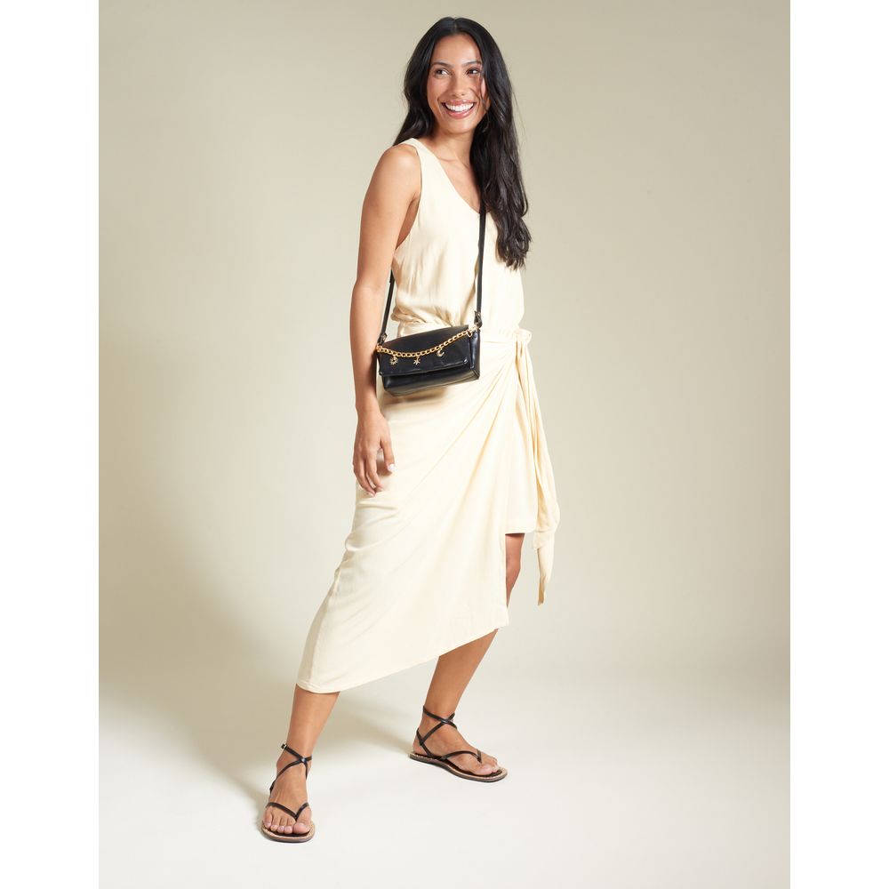 Bolsa pequena em couro fly macio com alça de ombro em corrente com pingentes e alça tiracolo fixa em couro. Fechamento por zíper e botão ímã na tampa. Medidas: 11,5cm (A) x 18,5cm (L) x 5cm (P). Compacta e moderna, perfeita para produções noturnas.