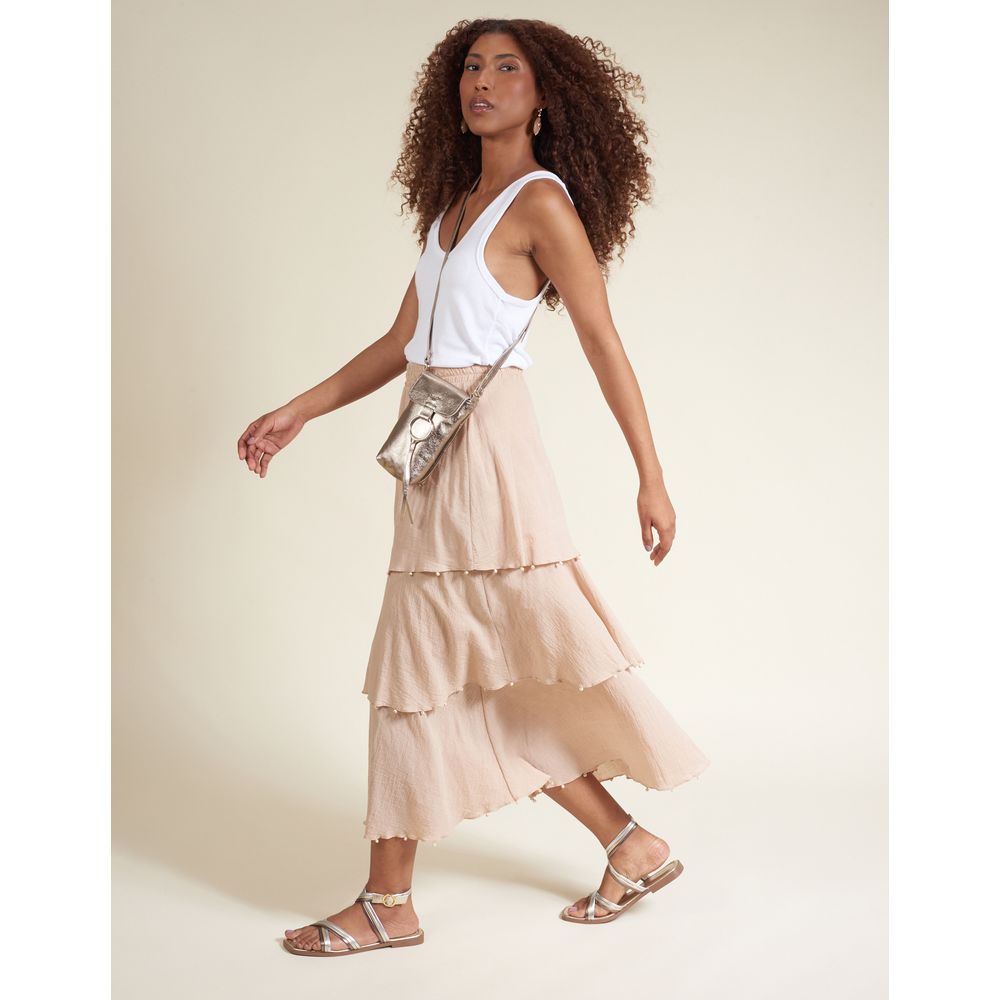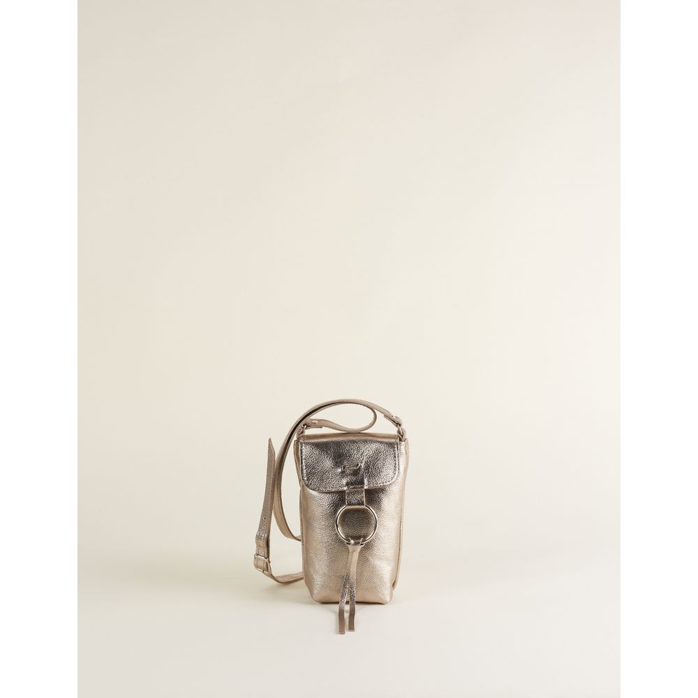 Bolsa pequena em couro floater metalizado, com tampa e detalhe de argola metálica acompanhada de tira em couro. Possui alça tiracolo no mesmo material, fechamento por botão de ímã, forro interno e assinatura Via Mia em metal. Elegante e moderna, é o toque perfeito de brilho para compor produções versáteis.