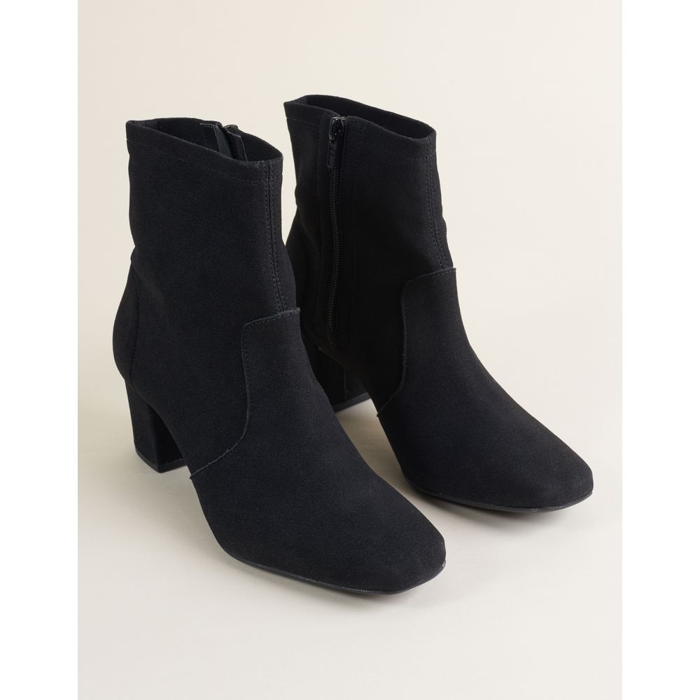 Bota de cano curto confeccionada em camurça soft, trazendo textura e um visual elegante. Possui salto bloco médio que garante mais estabilidade no uso e fechamento por zíper, facilitando o calce. Altura do salto: 6 cm.