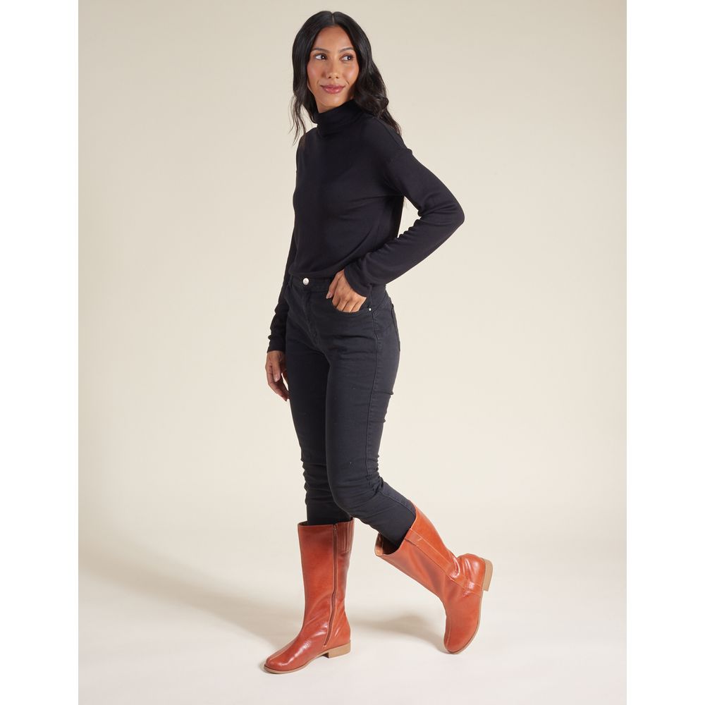 Bota de montaria em couro encerado, cano longo e salto baixo. Estilo clássico e atemporal, perfeita pra looks de inverno.