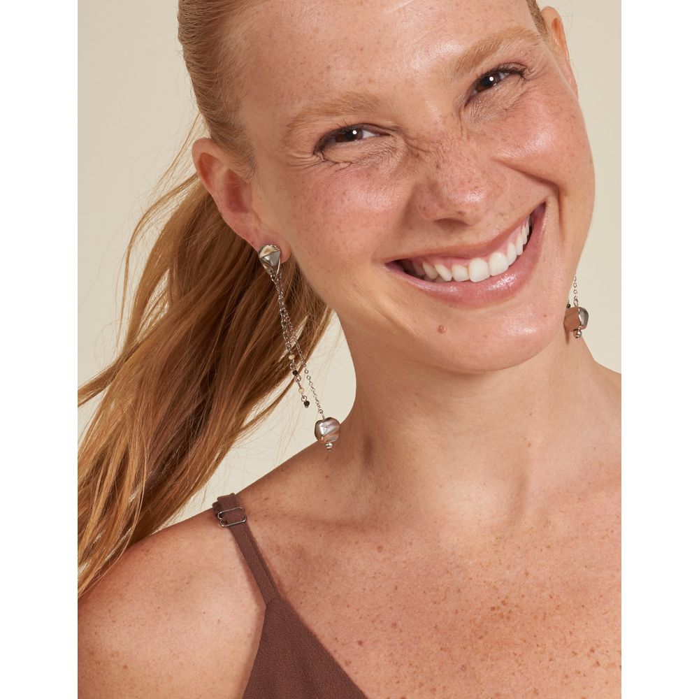 Brinco em formato orgânico, com corrente e pingente na ponta. Fechamento por tarraxa e detalhe extra de corrente fina com miçangas. Medidas: 9cm (C)