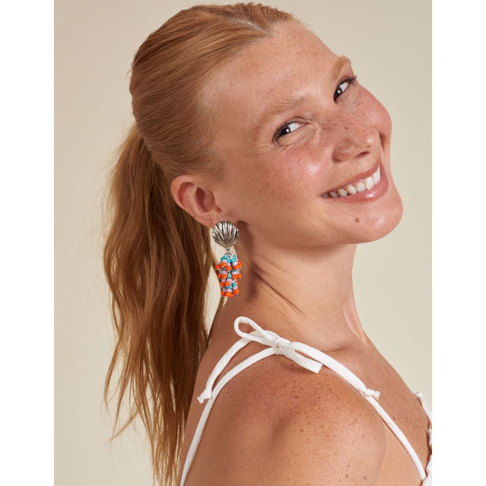 Brinco com pino em formato de concha e penduricalho de cristais e miçangas. Um detalhe marcante para produções de verão.