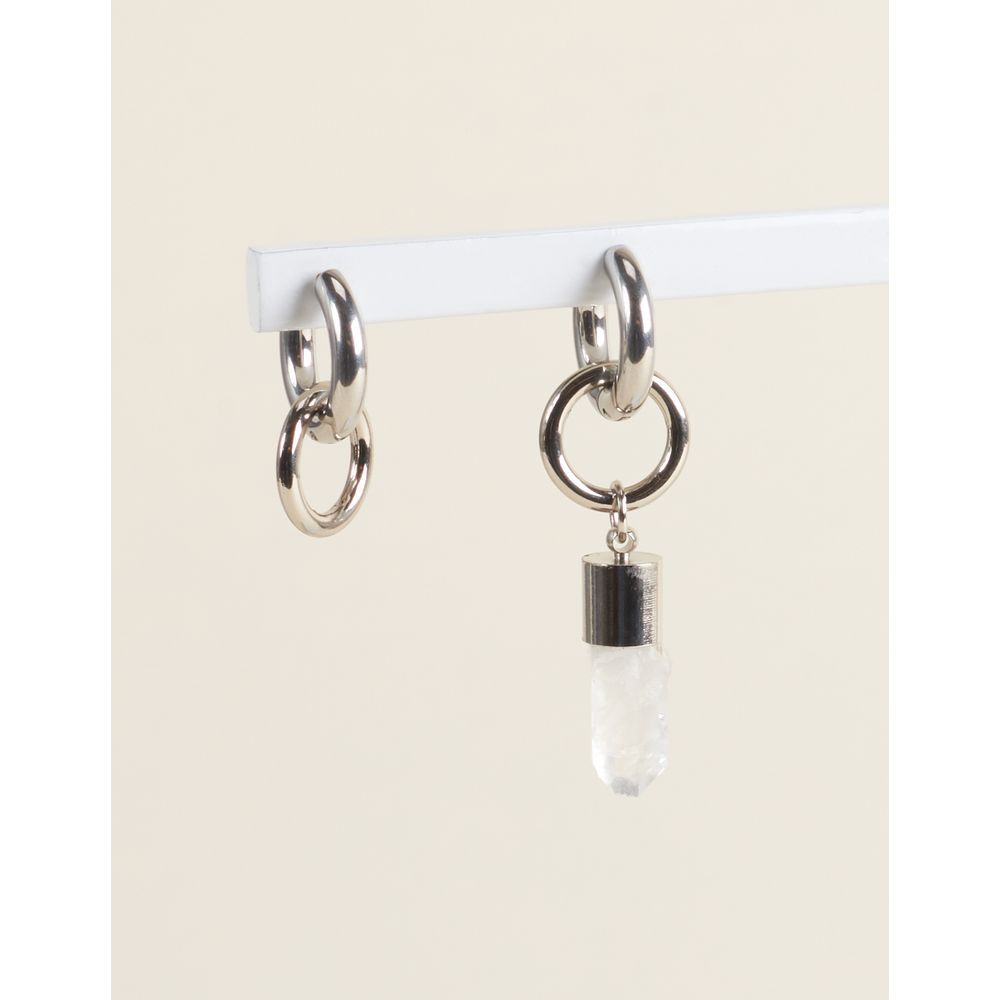 Brinco descasado com composição assimétrica: um dos lados traz argola com pingente circular e ponta de cristal natural, enquanto o outro combina argola com pingente circular. O mix cria um visual moderno e cheio de personalidade.
