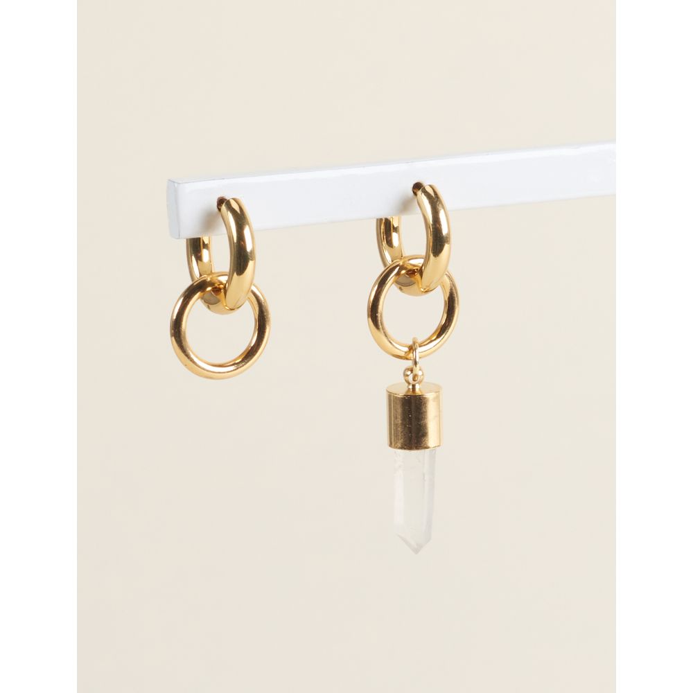 Brinco descasado com composição assimétrica: um dos lados traz argola com pingente circular e ponta de cristal natural, enquanto o outro combina argola com pingente circular. O mix cria um visual moderno e cheio de personalidade.