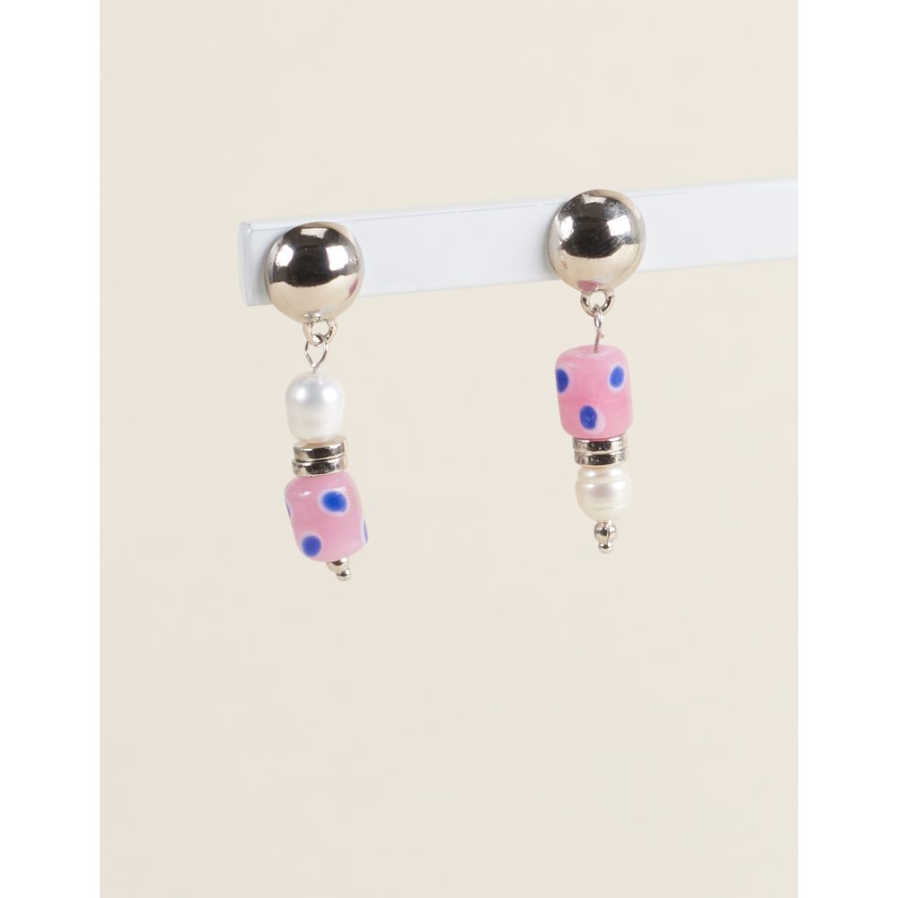 Brinco descasado com pérola natural e murano de poá, combinado com detalhe de disco de metal que traz contraste ao modelo. O pino redondo em metal reforça o acabamento, enquanto o fechamento por tarraxa garante praticidade e segurança no uso.