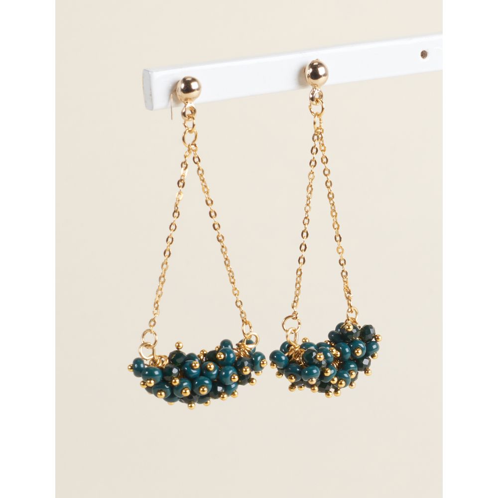 Brinco tipo pêndulo em corrente delicada, com detalhe central em cristal e miçangão. Fechamento por pino de bolinha com tarraxa. Medidas: 7,5cm (C)