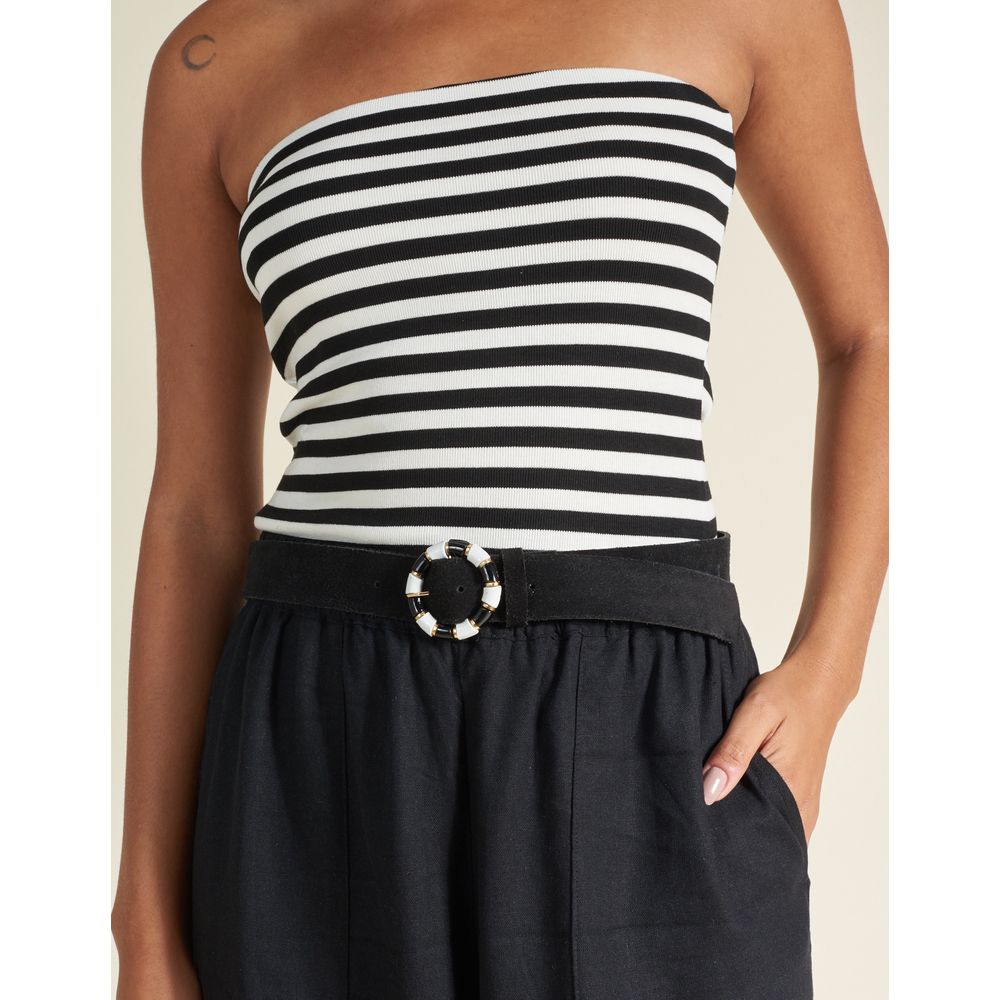 Destaque nos detalhes: cinto em couro camurça com fivela redonda em metal ouro e aplicações resinadas em preto e branco.
