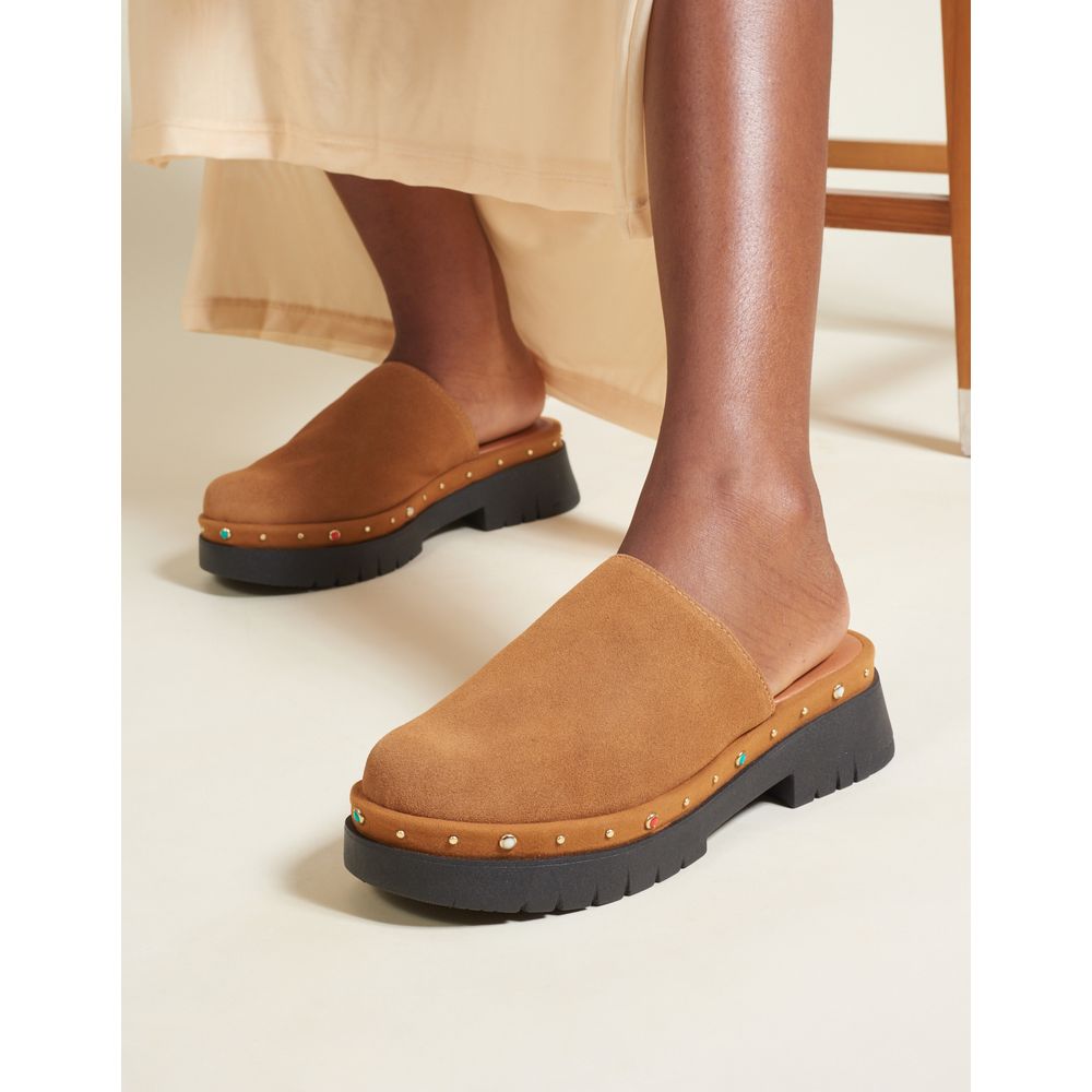 Clog em couro camurça com aplicação de metais coloridos e forro no mesmo tom. O solado preto e o formato robusto garantem conforto e presença. Uma aposta moderna e despojada pra quem gosta de looks com personalidade e está por dentro das tendências da estação. Esse item dá um toque boho-chic às produções e está super em alta!