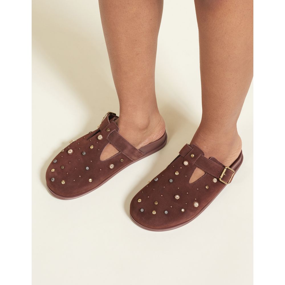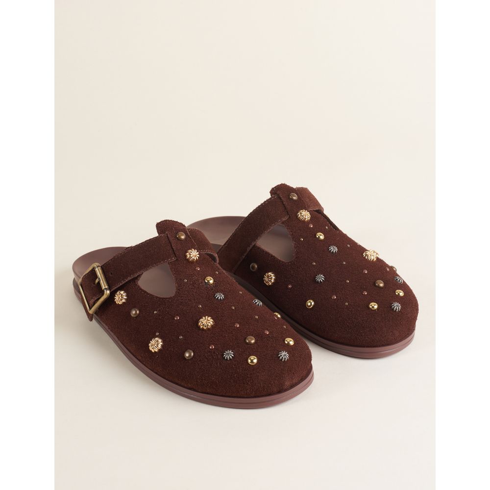 Mocassim estilo clog com cabedal em couro camurça, que recebe aplicações de metais e detalhe em fivela seguindo a tendência da estação. O modelo é forrado e conta com palmilha de papete e solado de borracha, garantindo conforto no uso diário. Uma escolha versátil que une estilo e praticidade pra acompanhar a rotina.