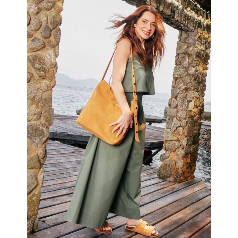 Da coleção em parceria com Leticia Spiller: Um verão pra viver junto. Desenvolvida em couro camurça, essa bolsa une estilo e versatilidade. O fechamento em zíper acompanha o tom do couro, enquanto os metais aplicados nas laterais e na alça trazem um charme extra. Espaçosa, é perfeita para quem gosta de estilo no dia a dia. Medidas: 33cm (A) x 31cm (L) x 15cm (P)