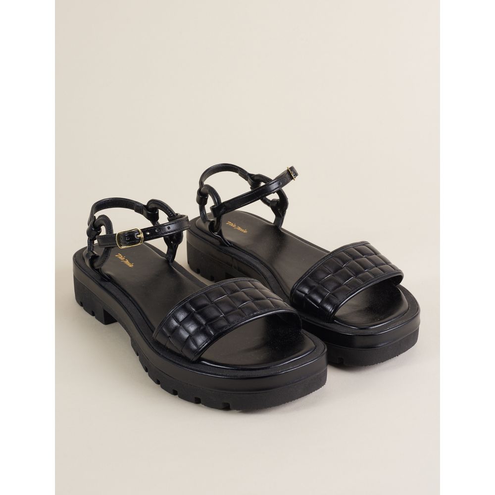 Flatform com tira frontal do cabedal em couro texturizado, trazendo destaque e informação de moda ao visual. As tiras de fechamento e a palmilha em material soft liso garantem conforto e praticidade, com ajuste por fivelinha. O solado moderno de borracha na cor preta conta com detalhe em tira de acabamento, completando o design com um toque atual.