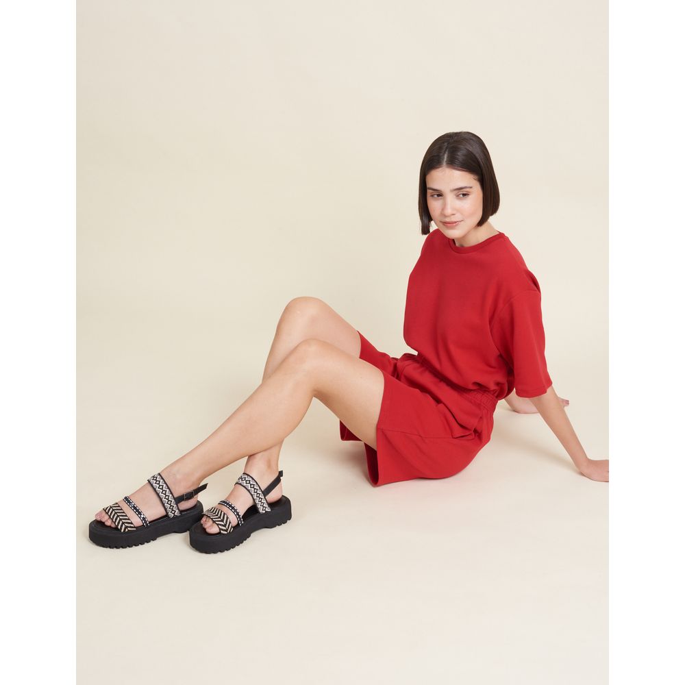 nós amamos! Essa flatform com cabedal de mix de cadarços preto e branco com detalhe de brilho, é super moderna e um dos nossos xodós! Ela tem uma tira de fechamento traseiro em soft, material alternativo ao couro, com fivela de metal, palmilha também em soft e solado tratorado, perfeita pra quem adora um look mais descolado e cheio de personalidade. Salto de aprox.: 4,5 cm
