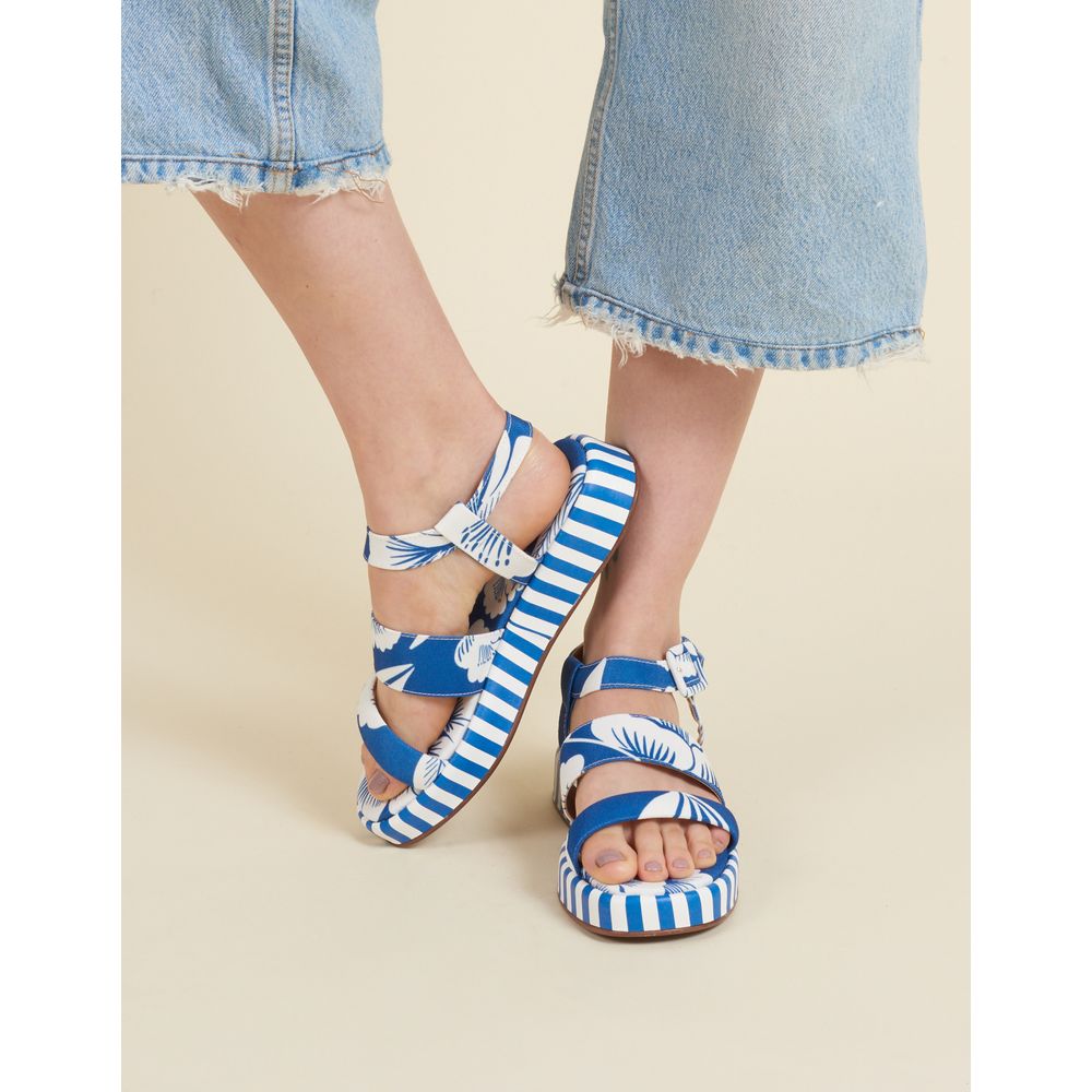 Se você ama um mix de estampas, essa flatform é a sua cara! Feita em tecido com a estampa Floral Navy e listras, ela tem fechamento com fivela pintada na cor da estampa e cepa e palmilha estampadas também. Um verdadeiro festival de cores e estilo!