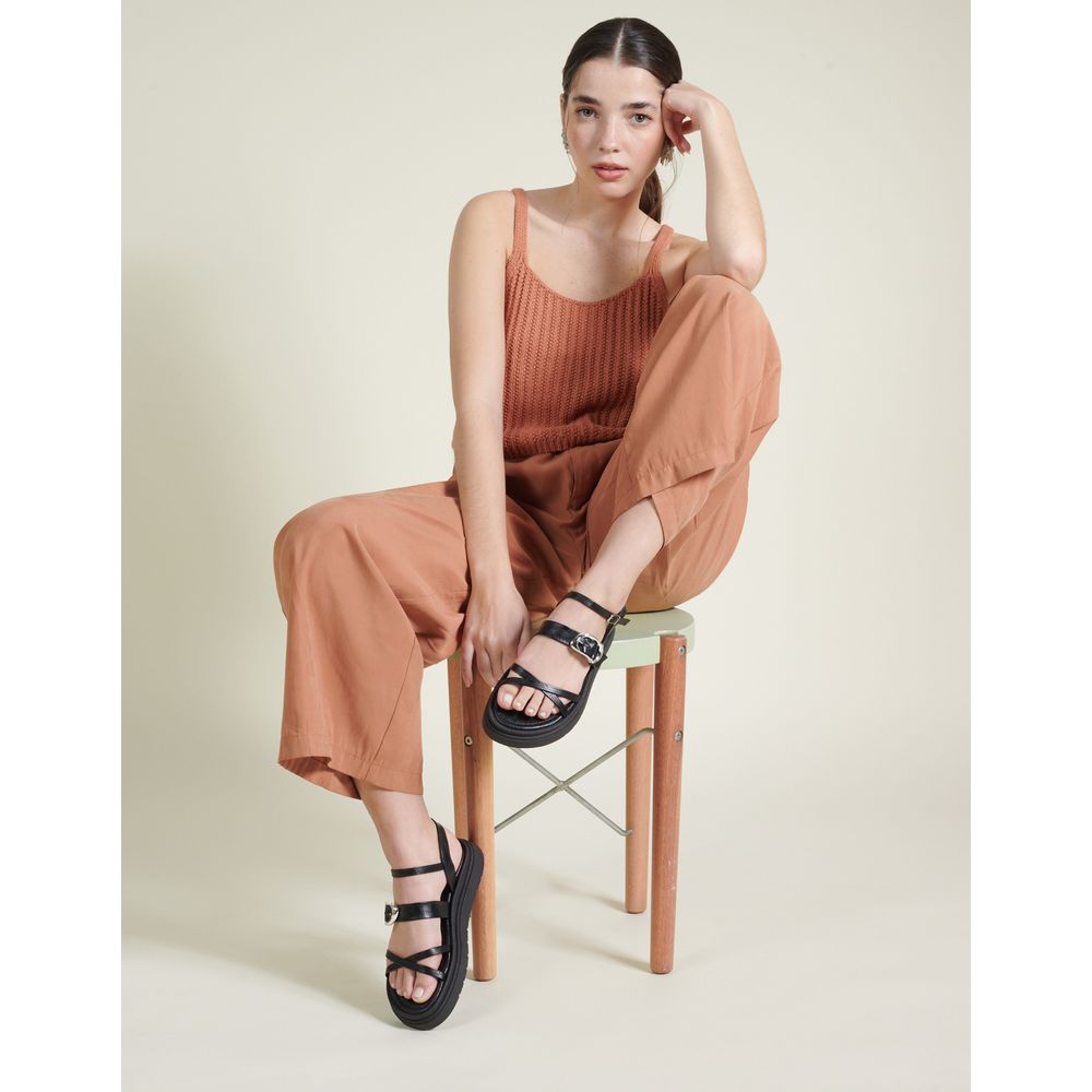 Flatform com duas tiras cruzadas e fivela orgânica. Palmilha e acabamento no mesmo material e tom das tiras. Leve, moderna e versátil, essa plataforma combina com vestidos, jeans ou alfaiataria descontraida. Um modelo pra quem ama conforto com visual atual.