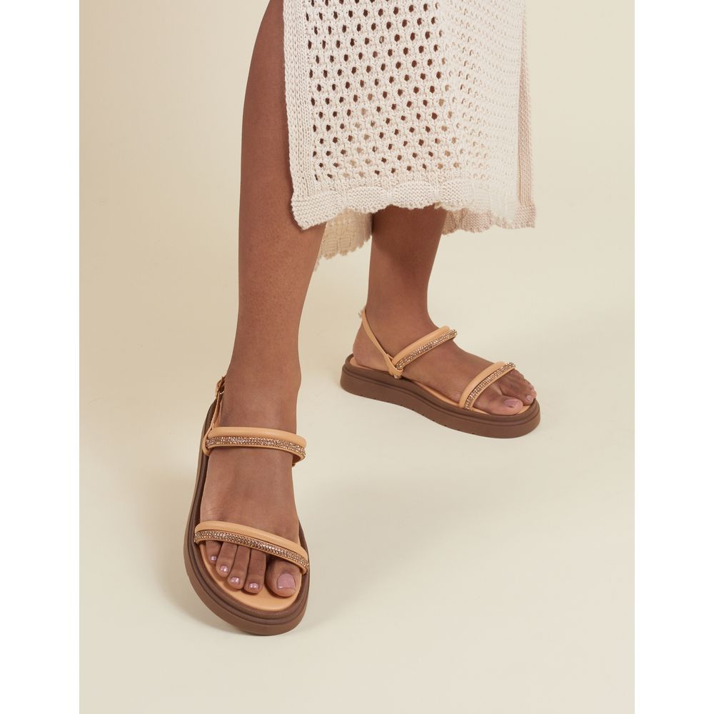 O detalhe brilhoso no cabedal de tiras dá um toque glam a essa flatform em material soft, alternativo ao couro. A palmilha e a detalhe de vira do solado emborrachado completam o visual moderno e prático.