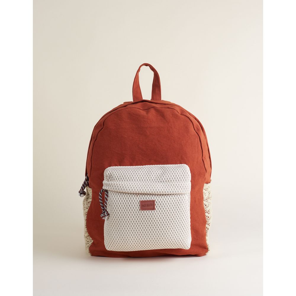 Mochila em lona com bolso frontal em tecido esportivo e laterais em tricô vazado. Puxadores em cadarço tricolor. Medidas: 41cm (A) x 30cm (L) x 14,5cm (P). Moderna e prática, perfeita para a rotina.