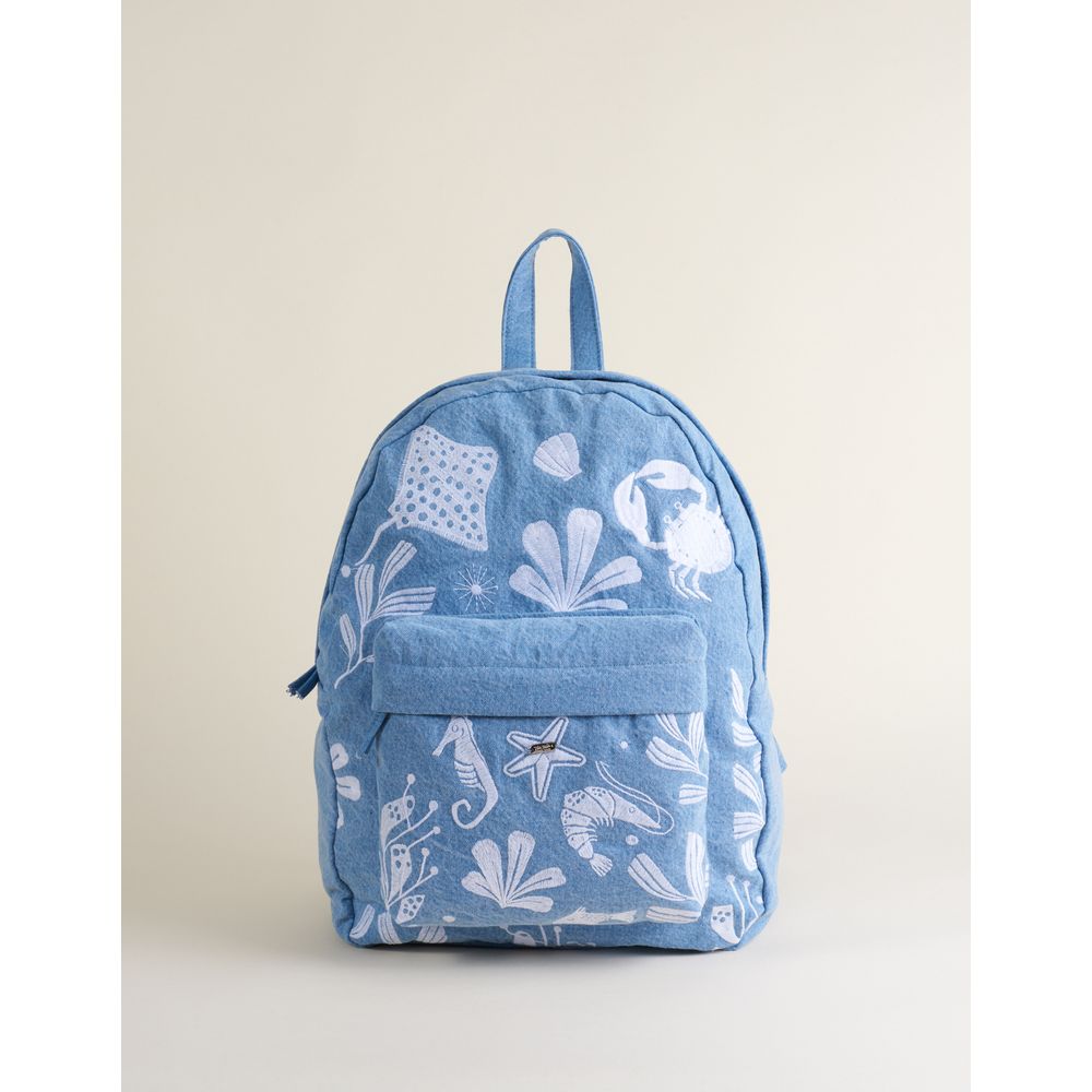 Mochila jeans com bordado de elementos do mar em linha branca e bolso frontal. Medidas: 41cm (A) x 30cm (L) x 14cm (P). Casual e versátil, combina com looks urbanos.