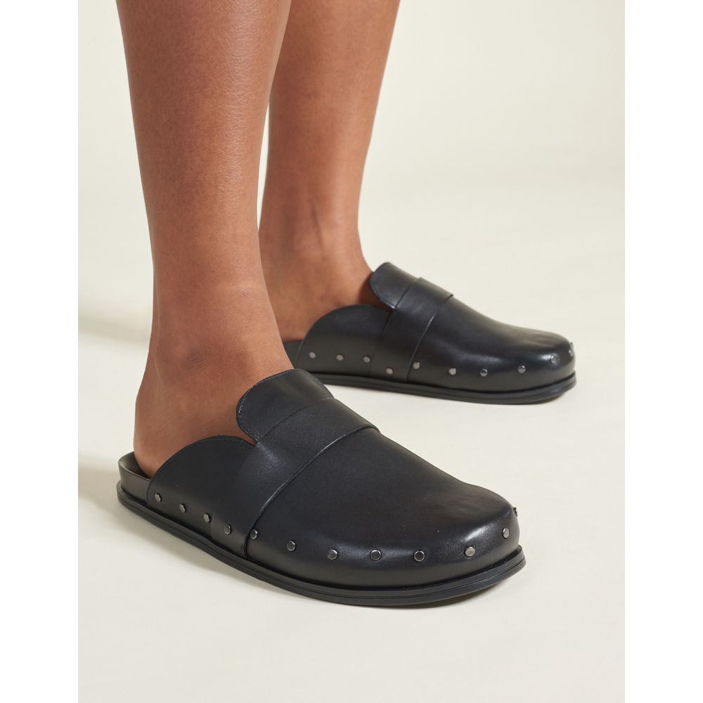 Mocassim mule em couro encerado com detalhe de gravata e rebites. Com palmilha anatômica e muito conforto. Pode apostar: as clogs são tendência na estação de Inverno 25!