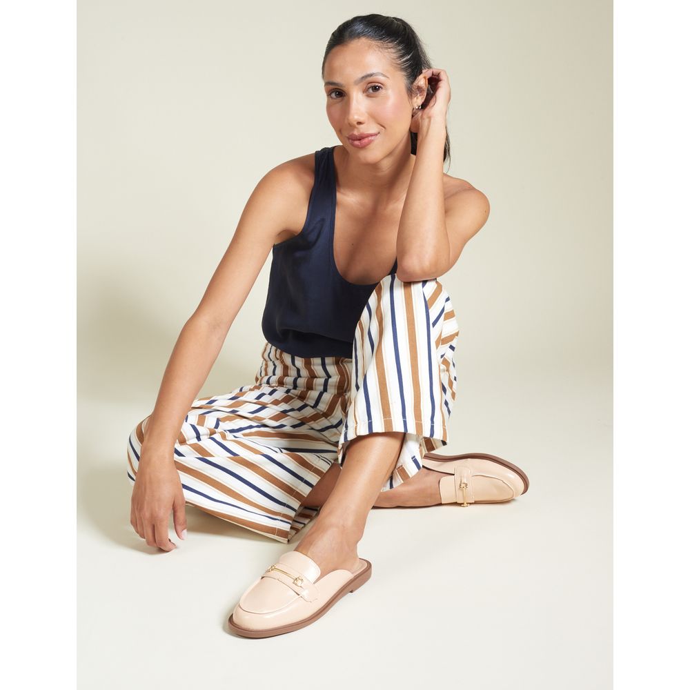 Mule em material soft com detalhe de enfeite em metal banho ouro light. Palmilha e forro no mesmo tom do cabedal. Elegante e fácil de combinar, é aposta certa para looks práticos e estilosos.