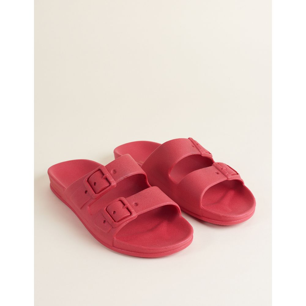 • BirkenSandália mais despojada com solado de cortiça de mais ou menos 2cm de altura. Pode ter fivelas ou não. Na Via Mia, essa construção está incluída na linha de Rasteira Fashion.