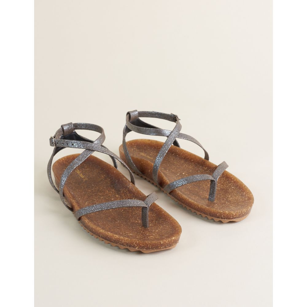 Papete com cabedal em tiras de material soft metalizado, fechamento em fivela, palmilha anatômica em cortiça e solado natural. Estilo e conforto unidos em um só modelo