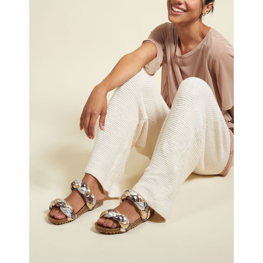 Papete em material soft metalizado com cabedal trançado em efeito puff. Palmilha em cortiça. Fashion e despojada, para produções modernas