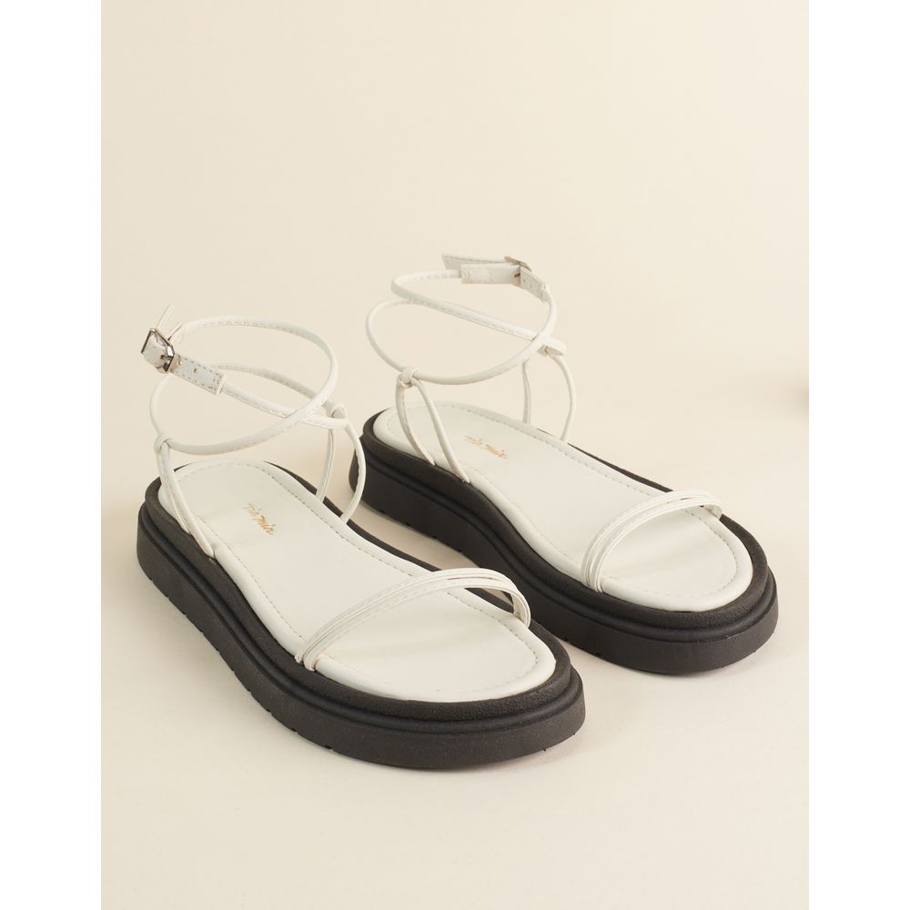 Plataforma com cabedal em tiras finas de material soft, palmilha no mesmo tom e fechamento em fivela. Medidas: salto 3,5cm. Delicada e moderna para produções leves.