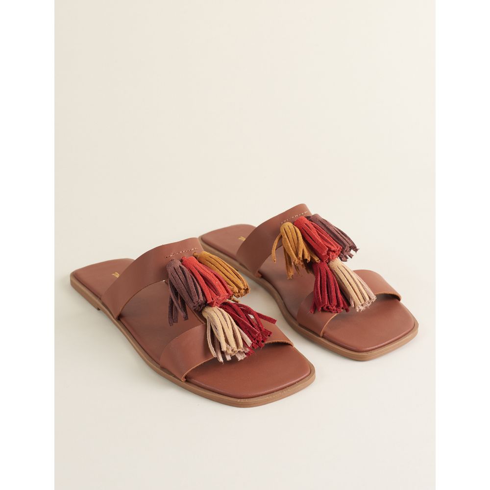 Rasteira estilo chinelo, sem fechamento, prática e fácil de calçar. Possui cabedal todo em couro, com detalhe em barbicachos coloridos que trazem charme e personalidade ao modelo.