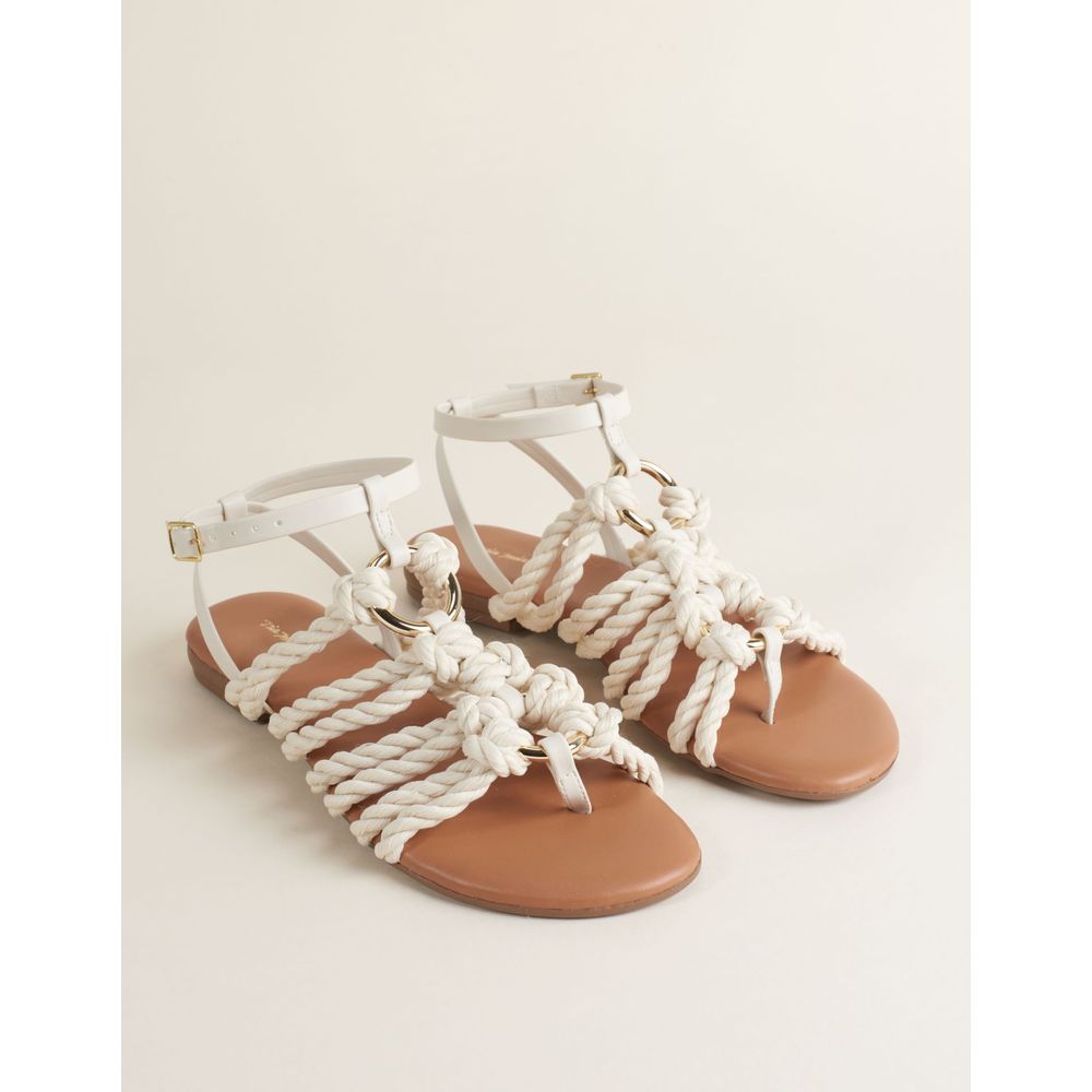 Rasteira em cordão São Francisco com argolas de metal e tira traseira em soft. Fechamento por fivela. Artesanal e estilosa, valoriza qualquer look.