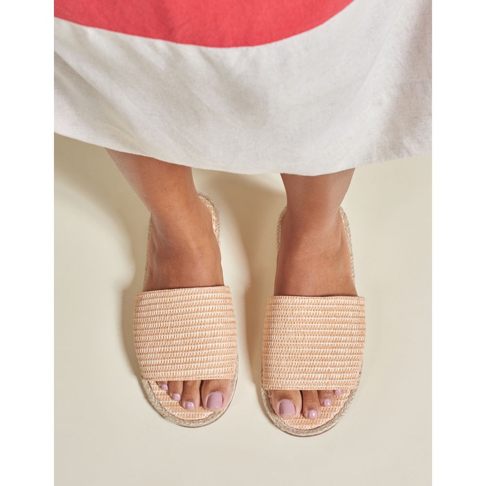 Rasteira com cabedal em tira única de palha natural, palmilha no mesmo material e detalhe em corda natural. A escolha perfeita para produções leve e com toque artesanal.