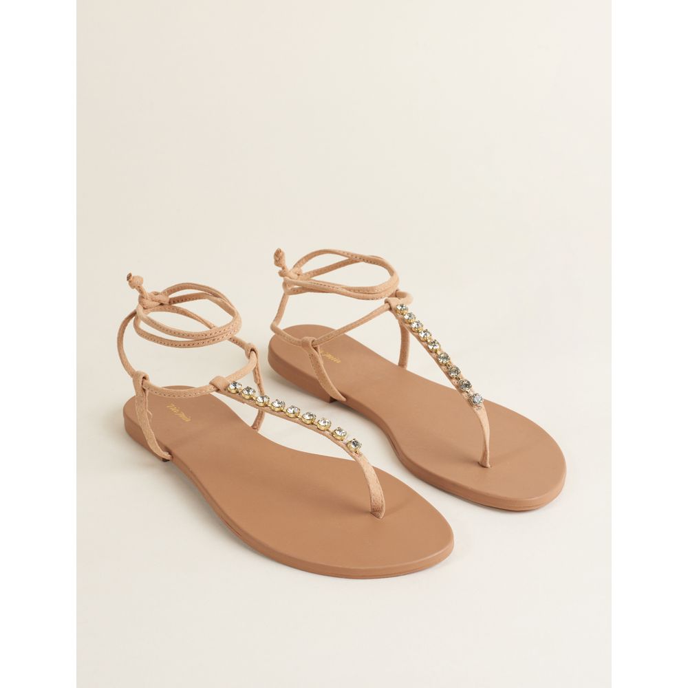 Rasteira em suede com tira decorada com aplicação de strass em caixa de metal. Possui fechamento por amarração. Delicada e sofisticada, traz brilho na medida certa para compor produções leves.