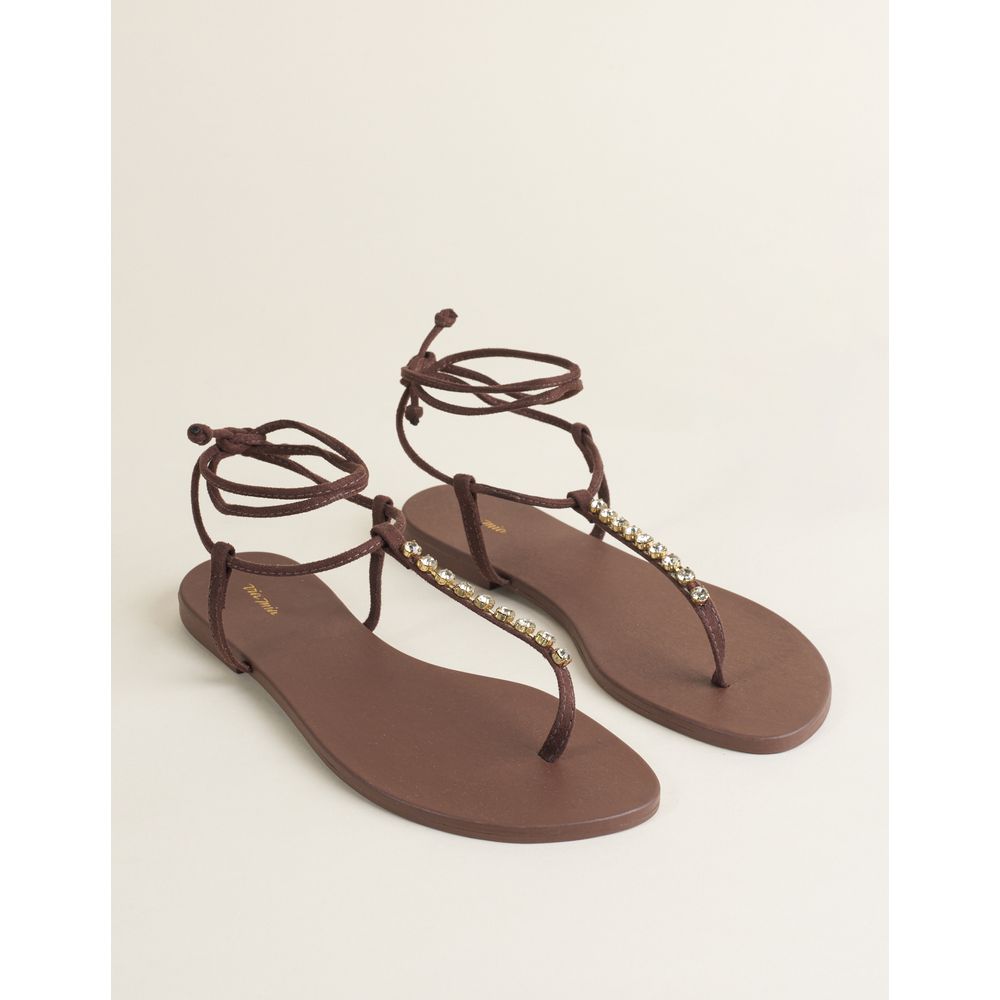 Rasteira em suede com tira decorada com aplicação de strass em caixa de metal. Possui fechamento por amarração. Delicada e sofisticada, traz brilho na medida certa para compor produções leves.