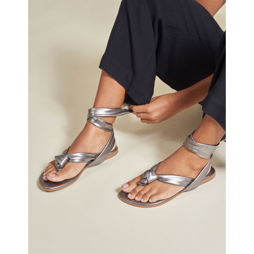 Rasteira Metalizada Com Nó E Amarração - Prata Velho
