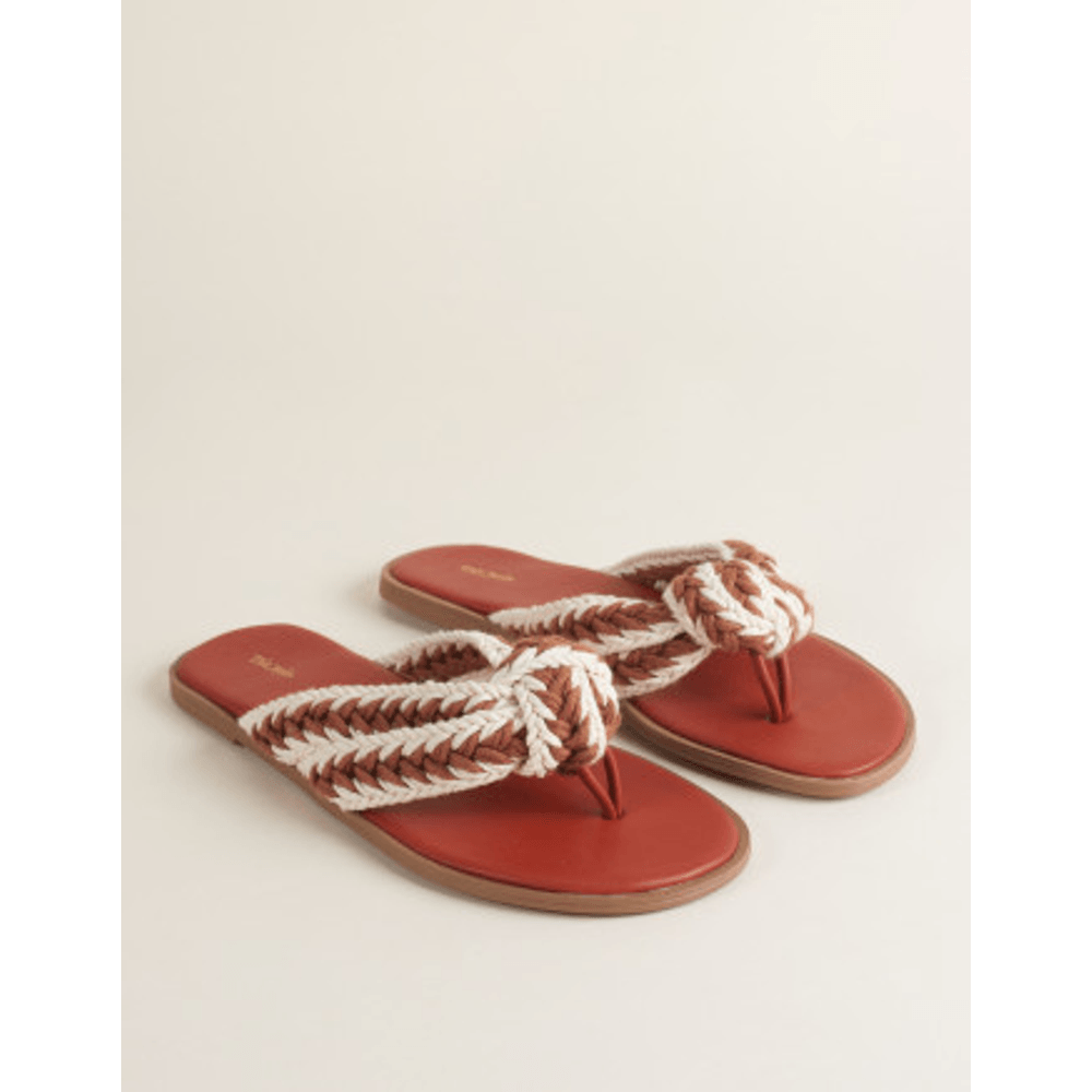 Rasteira estilo chinelo de dedo em tecido tramado tipo crochê, com detalhe em nó no cabedal. Descontraída e leve, perfeita para produções casuais.
