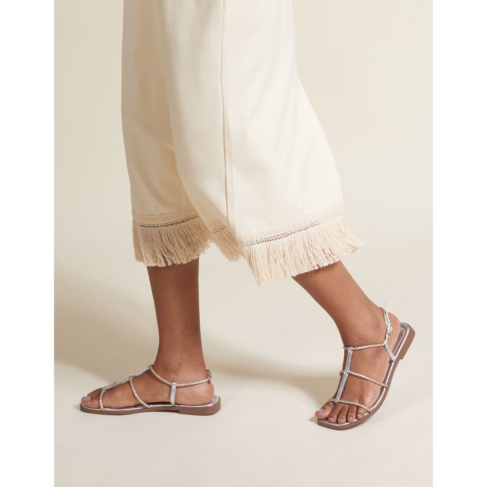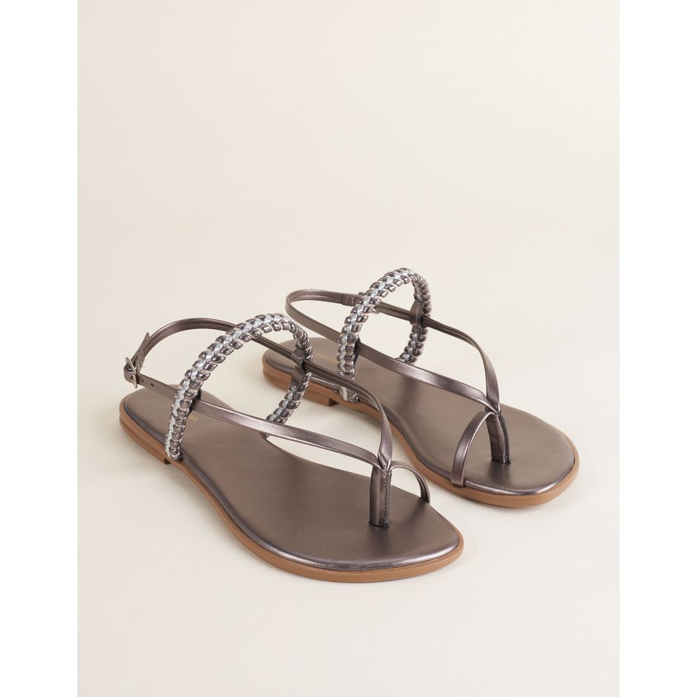 Rasteira com tiras de material soft metalizado, detalhe de tira trançada no peito do pé, fechamento em fivela e palmilha no mesmo tom do cabedal. Delicada e versátil, com um toque de brilho.