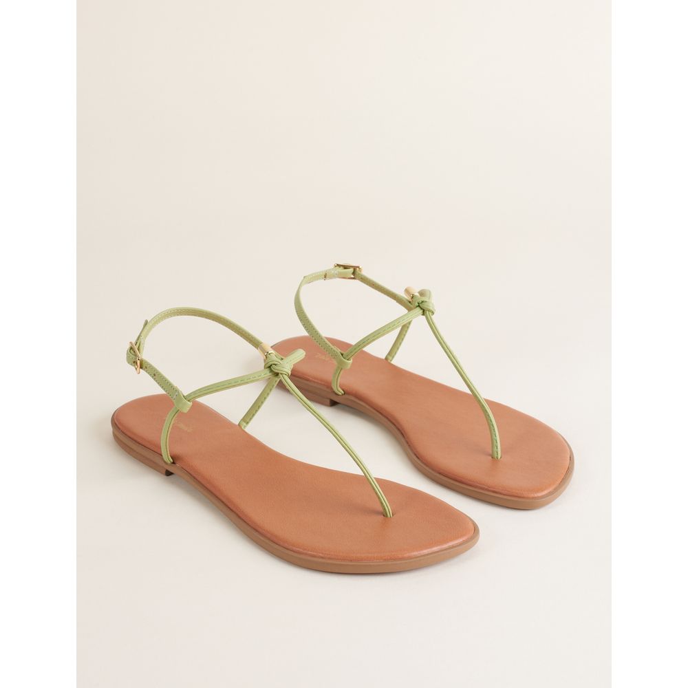 Rasteira salomé com tiras finas em material soft, detalhe de nó e ponteira. Fechamento por fivela e palmilha no mesmo tom do cabedal. Delicada e feminina para compor produções leves