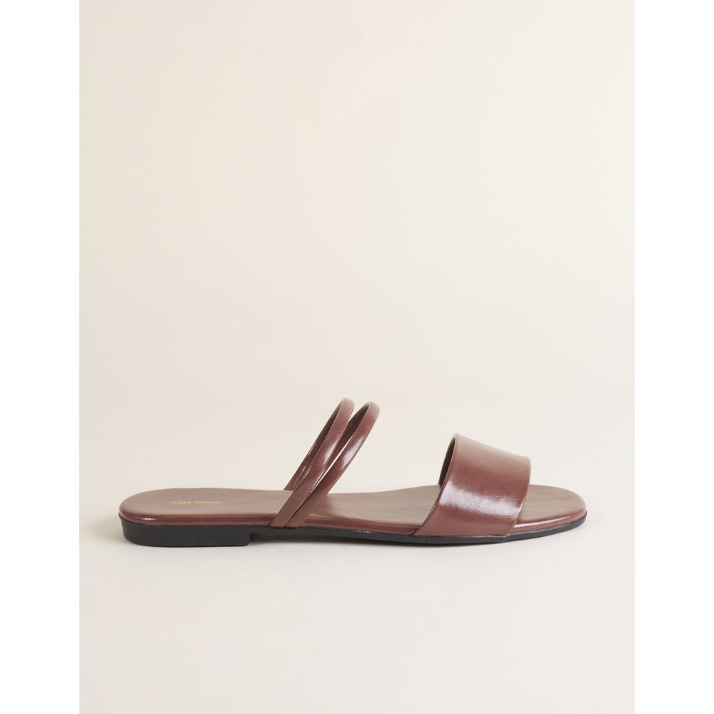 Rasteira em tiras de material soft com efeito encerado. Palmilha forrada e solado de borracha. Simples e versátil, combina com qualquer look casual.