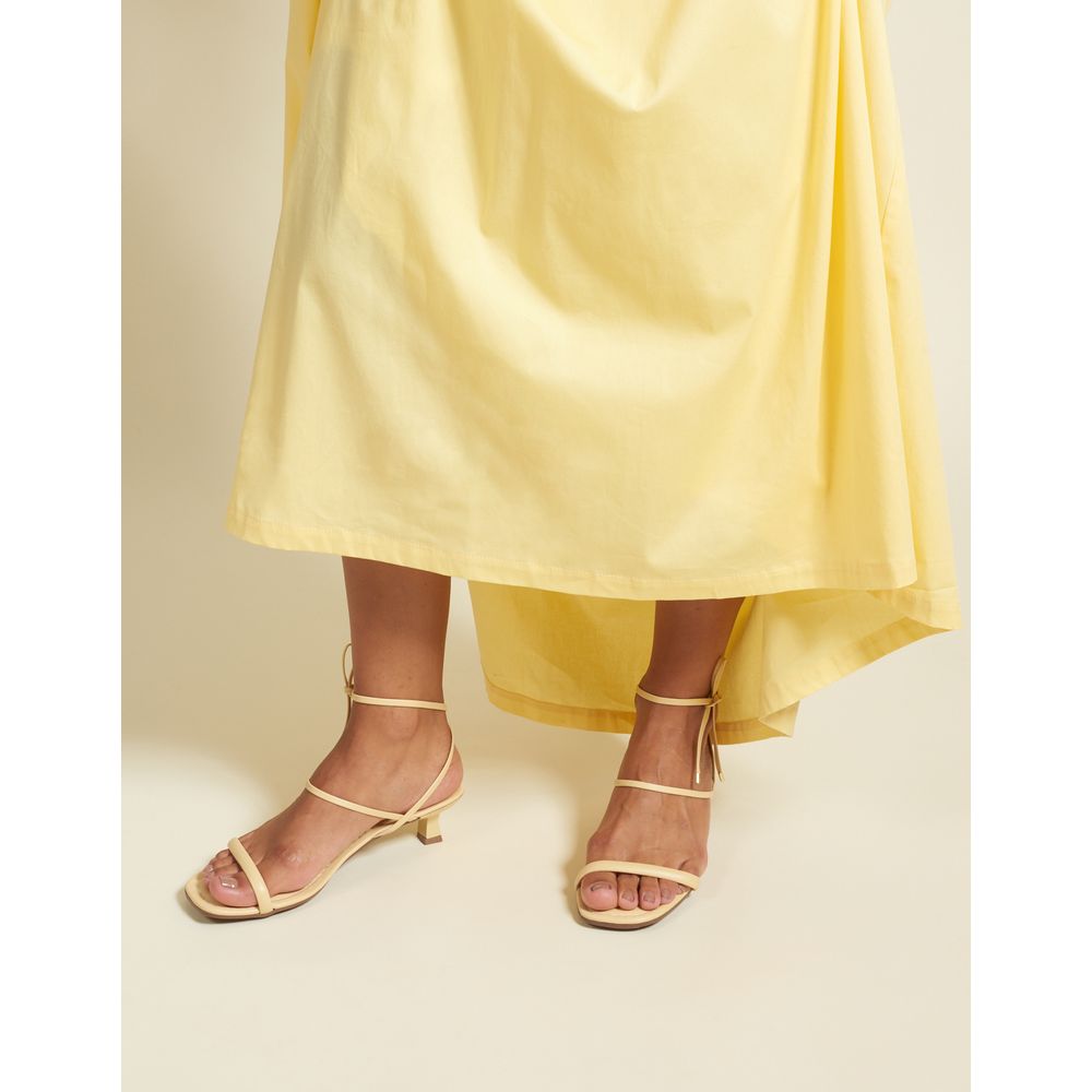 Sandália de salto médio com tiras finas em material soft, fechamento de amarração com ponteiras metálicas e salto kitten pintado no mesmo tom. Palmilha acolchoada.