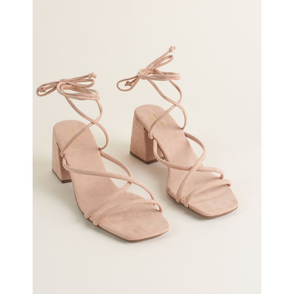 Sandália média com cabedal em tiras de meia cana em suede. Palmilha, salto forrado e tira de amarração no mesmo material do cabedal. Delicada e charmosa para looks versáteis.